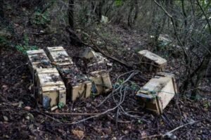 Des caisses d’armes et de munitions du Hezbollah ont été détruites lors de l’attaque de l’armée de l’air israélienne, le 13 janvier 2025.