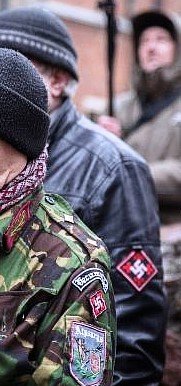 Fier de son passé. Les Lettons participent à la marche annuelle en hommage aux troupes qui ont combattu aux côtés des nazis le 16 mars 2019 à Riga. On aperçoit les croix gammées sur l’épaule supérieure gauche de ces hommes qui participent à la cérémonie d’honneur des membres des unités SS de la Légion lettone à Riga. (Avec l’aimable autorisation de JFDA eV / Grischa Stanjek)