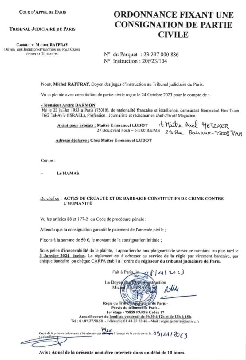 Ce jeudi 09 novembre 2023, le Doyen des Juges d’Instruction du Pôle Crime contre l’humanité a jugé recevable la plainte déposée par André Darmon, Directeur-fondateur d’Israël Magazine et ses avocats le 24 octobre (15 jours plus tôt), qui vise à exposer devant la Cour, les procédés génocidaires mis en œuvre par l’organisation terroriste Hamas, qu’illustrent les événements du 7 au 9 octobre 2023.