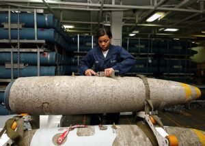 Lauren Carr, aviatrice de l’Aviation Ordonance d’Atlanta, met un interrupteur sur une bombe polyvalente MK-84 de 2 000 livres dans un magasin d’armes à bord de l’USS George Washington